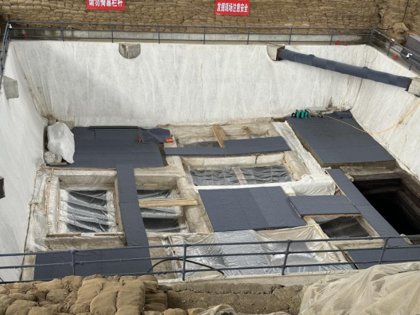 2020年9月起,一號墓發(fā)掘工作開始。至2023年11月,完成封土和填土發(fā)掘,12月提取了槨室上鋪設(shè)的竹席。這期間,建設(shè)了一號墓現(xiàn)場保護(hù)大棚和文物庫房、文物保護(hù)實(shí)驗(yàn)室、宿舍等必要的配套設(shè)施。2024年3月7日開始拆解提取槨蓋板,至3月27日,四層槨蓋板已全部安全提取完成,共計(jì)443根,總重約153噸。現(xiàn)已進(jìn)入槨室發(fā)掘第二階段,即槨室內(nèi)部的發(fā)掘清理。