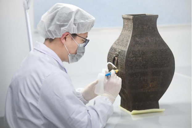 考古人員對出土青銅器進(jìn)行保護(hù)清理